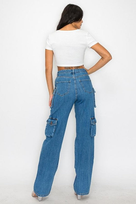 HIGH RISE MULTI POCKETS DISTRESSED CARGO JEANS